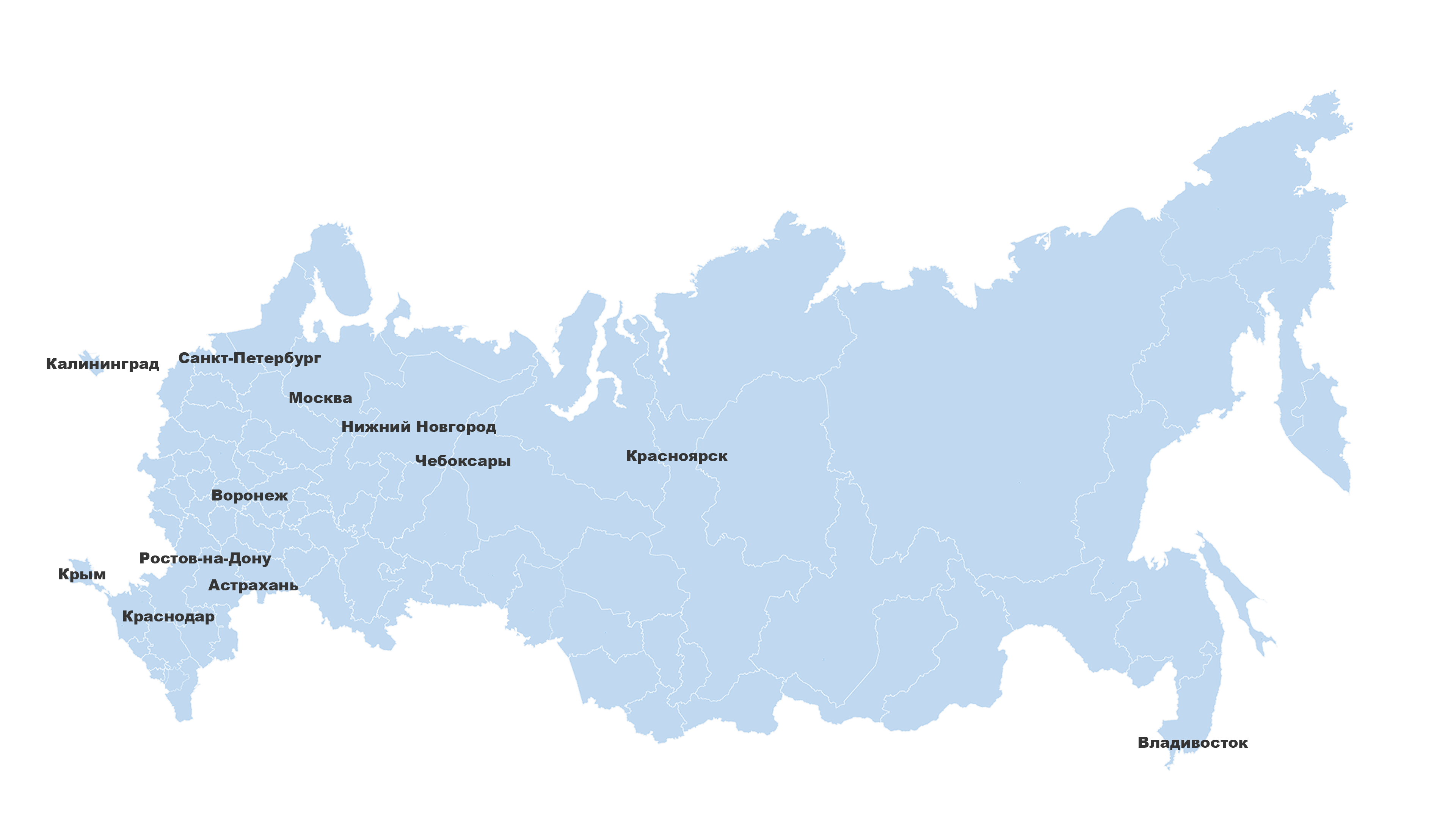 Прямые контракты с аккредитованными лабораториями в 14 городах Российской Федерации